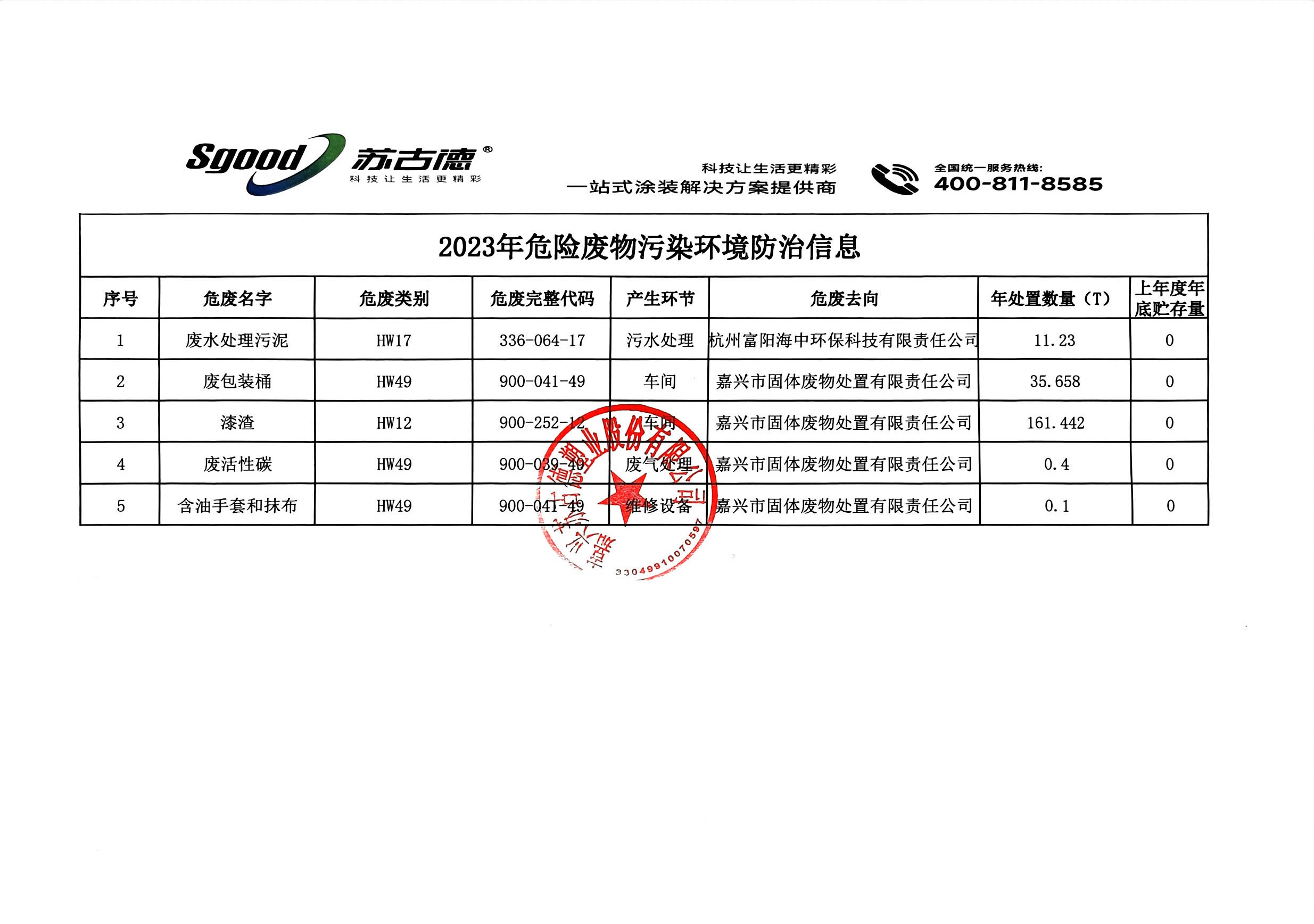 Public Disclosure of Jiaxing SGOOD Plastics Co., Ltd.'s 2023 Hazardous Waste Pollution Prevention and Control Information