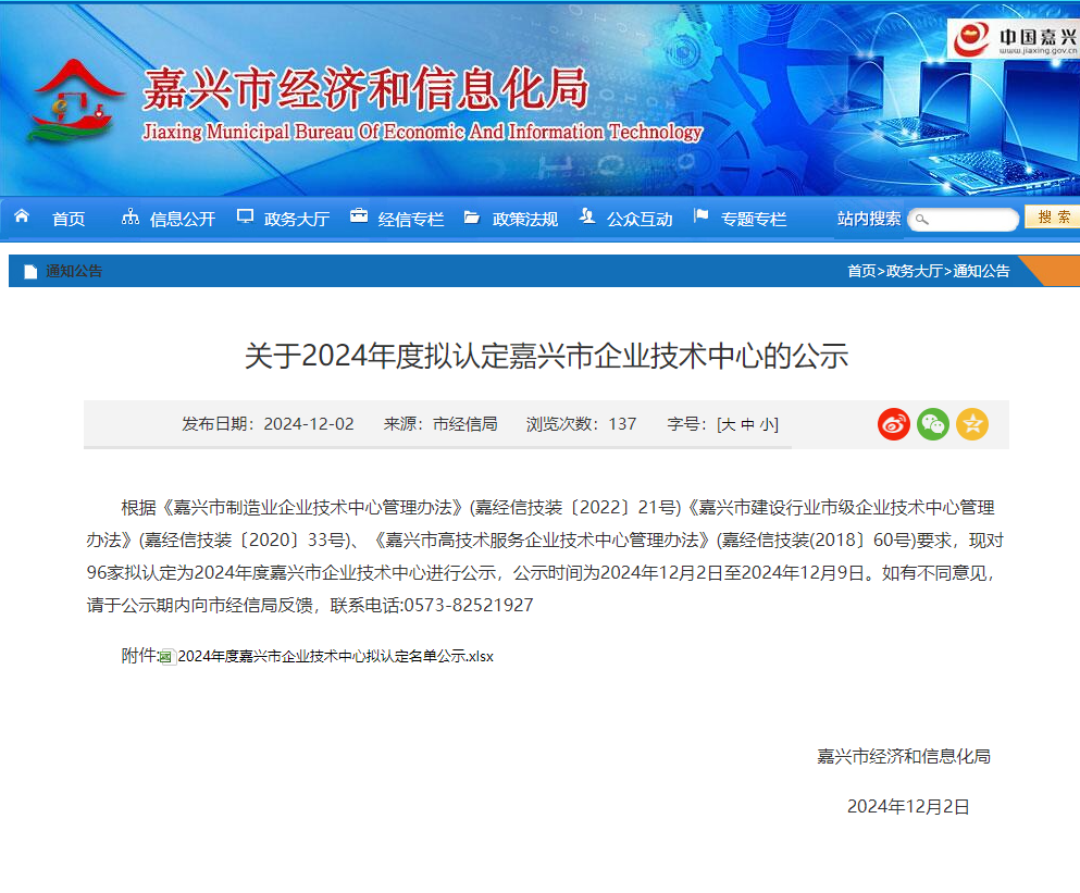 关于2024年度认定嘉兴企业技术中心的公示